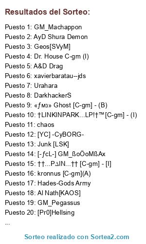 Lista de participantes: GM_Pegassus, S.S. "†"A&D"†" Gilgamesh, kronnus [C-gm](A), «ƒмנ» Ghost [C-gm] - (B), A&D Minos, Dr. House C-gm (I), †LINKINPARK...LP!†™[C-gm] - (I), [YC] -CyBORG-, xavierbaratau--jds, FoLkeN, [-ƒcL-] GM_ßoÖoMßAx, GM_Darkmauv, Geos[SVyM], Al Nath[KAOS], chaos, GM_Machappon, A&D Drag, Hidan [RYP], Urahara, DANIELGUIZA9 [LSK], [ƒcj][[Gods Army]] ®øLø The Returns, DarkhackerS, Junk [LSK], Hades-Gods Army, [[Gods Army]] Dark Master, Unratito, AyD Shura Demon, Max2260[*T.A.K.A* ﱢﱟﱞﱡ۩ﱡﱞﱟﱢ Halcon], HADEZ[PHOENIX]//YAKUZA//, [Pr0]Hellsing, [Pr0] Bakura , GM_SlIkTeR666, ††...P∆IN...†† [C-gm] - [I], Darksoul [C-gm] (B), Plaza 01, Plaza 02.