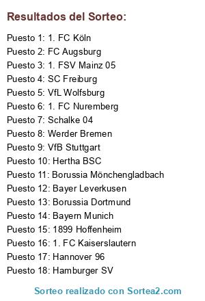 Lista de participantes: FC Augsburg, Bayer Leverkusen, Bayern Munich, Borussia Dortmund, Borussia Mönchengladbach, SC Freiburg, Hamburger SV, Hannover 96, Hertha BSC, 1899 Hoffenheim, 1. FC Kaiserslautern, 1. FC Köln, 1. FSV Mainz 05, 1. FC Nuremberg, Schalke 04, VfB Stuttgart, Werder Bremen, VfL Wolfsburg.