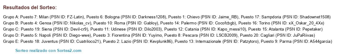 Lista de participantes: Puesto 1: Chievo (PSN ID: Jaime_RB), Puesto 2: Lazio (PSN ID: Kevplunk86), Puesto 3: Fiorentina (PSN ID: Yuyimo, Puesto 4: Genoa (PSN ID: Nikolas_cv), Puesto 5: Napoli (PSN ID: Diego-wwe), Puesto 6: Bologna (PSN ID: Darkness1208), Puesto 7: Milan (PSN ID: FZ-Latin), Puesto 8: Pescara (PSN ID: LSCB2009), Puesto 9: Parma (PSN ID: A544garcia), Puesto 10: Roma (PSN ID: Gabloy), Puesto 11: Udinese (PSN ID: Dilo2003), Puesto 12: Catania (PSN ID: Kapo_messi10), Puesto 13: Internazionale (PSN ID: Patzytoro), Puesto 14: Palermo (PSN ID: Cocofcbgb), Puesto 15: Atalanta (PSN ID: Pepetaker), Puesto 16: Torino (PSN ID: xX_Oskar_20_4Xx), Puesto 17: Sampdoria (PSN ID: Shadownet1508), Puesto 18: Juventus (PSN ID: Cuatriloco21), Puesto 19: Siena (PSN ID: Devil-cr9), Puesto 20: Cagliari (PSN ID: JuPaRiivas).
