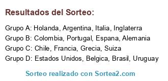 Lista de participantes: Espana, Alemania, Argentina, Portugal, Colombia, Suiza, Uruguay, Italia, Brasil, Holanda, Belgica, Grecia, Estados Unidos, Chile, Inglaterra, Francia.