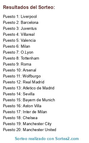 Lista de participantes: Sevilla, Aston Villa, Liverpool, Wolfburgo, Manchester City, Manchester United, Valencia, Chelsea, Juventus, Inter de Milan, Roma, Milan, Arsenal, Villareal, Atletico de Madrid, Tottenham, Bayern de Munich, Barcelona, O.Lyon, Real Madrid.