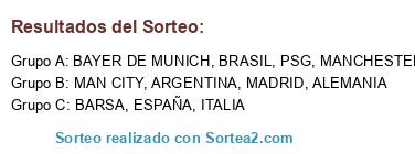 Lista de participantes: BAYER DE MUNICH, MADRID, BARSA, ESPAÑA, MAN CITY, BRASIL, PSG, ITALIA, ARGENTINA, ALEMANIA, MANCHESTER UNITED.