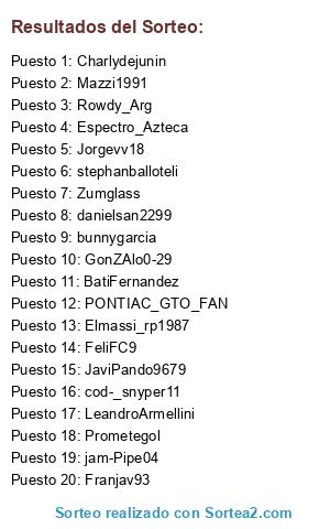 Lista de participantes: Mazzi1991, Prometegol, PONTIAC_GTO_FAN, cod-_snyper11, bunnygarcia, jam-Pipe04, Charlydejunin, danielsan2299, Rowdy_Arg, Elmassi_rp1987, stephanballoteli, BatiFernandez, Zumglass, JaviPando9679, GonZAlo0-29, FeliFC9, LeandroArmellini, Franjav93, Espectro_Azteca, Jorgevv18.