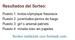 Lista de participantes: juventudes-perros de fuego, girl´s arsenal-patriots, kintos-olympique fressisuis, minabo kiev-sin papeles.