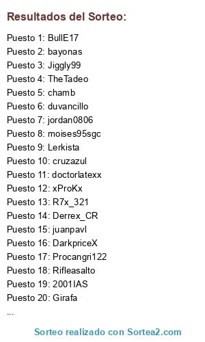 Lista de participantes: hotwopper, the_master153, sebas808, AJVG, angel96, ScaryGhost877, doctorlatexx, lKorastenom, 2001IAS, cruzazul, Paketitox, juanpavl, Dirmax65, 71Master17, moises95sgc, manushi23, Lerkista, hooper, Alexserban, Tille, Girafa, Eluveitie, jhonny131, .miguelito225., Ezio, rekster42, §J£r£§, niogear, BullE17, Santiago800, xProKx, chamb, R7x_321, jordan0806, chetazoas, JoseLobito, leandro500, XDsonicXD, mati1212, God, eliax9500, STORM_MEXx, black blizzar, Procangri122, LonnyXHero, belterrWAN, Rifleasalto, sonic_elerizo, TheTadeo, Jiggly99, moisesdark, duvancillo, erkens28, xsegget, bayonas, AGUILA32, Derrex_CR, ★Oº°‘¨Nana¨‘°ºO★, DarkpriceX, bidamillo, dark93c, Nicogar, pabelms17, cebollin12, beatles1231000.