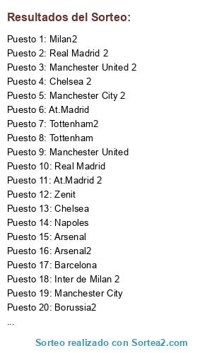 Lista de participantes: Barcelona, Barcelona2, Bayern Munich, Bayern Munich2, Tottenham, Tottenham2, Zenit, Zenit 2, Real Madrid, Real Madrid 2, Borussia, Borussia2, PSG, PSG2, Juventus, Juventus2, Manchester United, Manchester United 2, Manchester City, Manchester City 2, Milan, Milan2, Napoles, Napoles 2, At.Madrid, At.Madrid 2, Chelsea, Chelsea 2, Arsenal, Arsenal2, Inter de Milan, Inter de Milan 2.