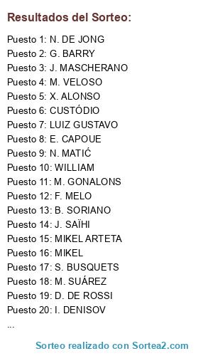 Lista de participantes: F. MELO, S. GERRARD, D. DE ROSSI, B. MATUIDI, X. ALONSO, T. MOTTA, A. PIRLO, R. COHADE, N. MATIĆ, S. BUSQUETS, A. SONG, CUSTÓDIO, G. BARRY, M. VELOSO, D. PIZARRO, J. MASCHERANO, LUIZ GUSTAVO, R. MAVUBA, M. VERRATTI, N. DE JONG, J. SAÏHI, MIKEL ARTETA, M. GONALONS, SANDRO, M. CARRICK, M. SUÁREZ, JAVI GARCIA, MIKEL, B. SORIANO, WILLIAM, E. CAPOUE, I. DENISOV.