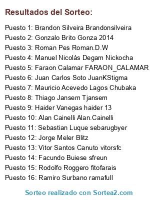Lista de participantes: Faraon Calamar FARAON_CALAMAR, Mauricio Acevedo Lagos Chubaka, Thiago Jansem Tjansem, Sebastian Luque sebarugbyer, Rodolfo Roggero fitofarais, Vitor Santos Canuto vitorsfc, Facundo Buiese sfreun, Manuel Nicolás Degam Nickocha, Haider Vanegas haider 13, Alan Cainelli Alan.Cainelli, Juan Carlos Soto JuanKStigma, Ramiro Surbano ramafull, Brandon Silveira Brandonsilveira, Gonzalo Brito Gonza 2014, Roman Pes Roman.D.W, Jorge Meler Blitz.