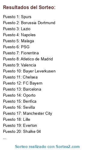 Lista de participantes: FC Bayern, Borussia Dortmund, Atletico de Madrid, Barcelona, Madrid, AC Milan, Inter, Juventus, Napoles, Arsenal, Chelsea, Liverpool, Manchester United, Manchester City, Spurs, PSG, Oporto, Zenit, Bayer Leverkusen, Shalke 04, Malaga, Sevilla, Valencia, AS Roma, Fiorentina, Lazio, Everton, Newcastle, Lille, Lyon, Marsella, Benfica.