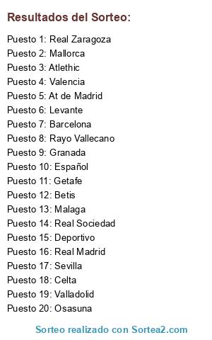 Lista de participantes: Valladolid, Getafe, Atlethic, Malaga, Sevilla, Mallorca, At de Madrid, Valencia, Real Madrid, Deportivo, Real Sociedad, Osasuna, Betis, Barcelona, Rayo Vallecano, Granada, Celta, Español, Real Zaragoza, Levante.