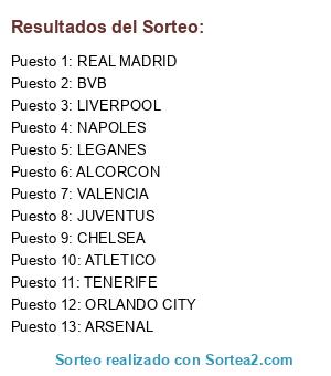 Lista de participantes: ORLANDO CITY, BVB, TENERIFE, NAPOLES, CHELSEA, ALCORCON, REAL MADRID, VALENCIA, LIVERPOOL, ATLETICO, LEGANES, ARSENAL, JUVENTUS.