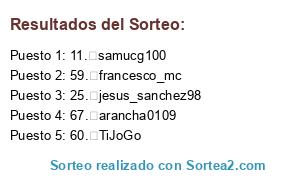 Lista de participantes: 1. jacobo270, 2. pmcaimari13, 3. danielmaichel, 4. NiallaterGaming, 5. ff9yitanix, 6. robernano12, 7. javiicruz5, 8. albams9, 9. rubentorrero, 10. pepesito08, 11. samucg100, 12. raquel41213, 13. pilaresquivias, 14. johanniidalia14, 15. santi0240, 16. enzoman15, 17. nacholarrosaa, 18. koaxhh, 19. guiller7nca, 20. antonnio_887, 21. polchu_14, 22. lotinafanlover, 23. josemdferreira, 24. 636523120, 25. jesus_sanchez98, 26. jose27_30, 27. davidmmontes, 28. juuankiivk10, 29. xuli23, 30. manumartinpl, 31. DiegoVii, 32. franky161089, 33. nataliadfer, 34. Light_mamba24, 35. carlosgb00, 36. gemarj4, 37. ffb442, 38. josemigm15, 39. carlos10_r, 40. ezca13, 41. apastor_riba, 42. riicardo02, 43. ivilaura, 44. fdtmirandes92, 45. JosemaLS24, 46. Diegocadahia, 47. TQHTPodcast, 48. javitorres26, 49. srom15, 50. palomarco97, 51. kokebe, 52. utrisfc, 53. luciiasastre, 54. ZeppelinClub, 55. trampantojo_, 56. cantax351, 57. aleropsm, 58. ceeeeen, 59. francesco_mc, 60. TiJoGo, 61. nanita1401, 62. pauiglesias12, 63. HJRM7, 64. cris_colman12, 65. SunderlandUY, 66. Dukimot, 67. arancha0109, 68. johncasriv89, 69. sususug, 70. inilloa, 71. slayoner14, 72. FicaCoaBola, 73. VARO_TW, 74. antonvieites_dg, 75. anntonnio_887, 76. manurodferb, 77. tomi18lopez, 78. terradegoles, 79. madeleynecordov, 80. charsjavier_, 81. moimolera, 82. robybest20, 83. gork19_, 84. marcosmouro6, 85. cordeveloper, 86. ismaaaa_98, 87. polcui.