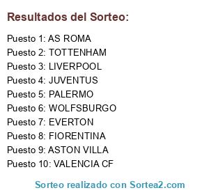 Lista de participantes: LIVERPOOL, TOTTENHAM, FIORENTINA, WOLFSBURGO, PALERMO, AS ROMA, JUVENTUS, VALENCIA CF, EVERTON, ASTON VILLA.