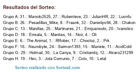 Lista de participantes: 1. RRober, 2. Prk, 3. Jota Comunio, 4. Oli, 5. Manitas, 6. The Animal, 7. Colo, 8. Fraank, 9. Cristiandq, 10. Letal, 11. AcidCold, 12. Alvaro231299, 13. Manillas, 14. Noir, 15. Mariete, 16. Neurobyte, 17. Chooloz, 18. Erreala, 19. Hec, 20. Ivanolico, 21. Emijuansolo, 22. Luonfu, 23. JulianHR, 24. Saimon1393, 25. Martinares, 26. Pesadillas_Mike, 27. Rubenteve, 28. Chakon, 29. Holmail, 30. La Canya, 31. Manolo2525, 32. Danieliyo94.