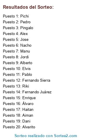 Lista de participantes: Jose, Pedro, Pablo, Pingalo, Pichi, Fernando Juárez, Elvis, Enrique, Fernando Sierra, Dani, Alvarito, Riki, Alberto, Nacho, Aiman, Jordi, Haitan, Álvaro, Manu, Alex.