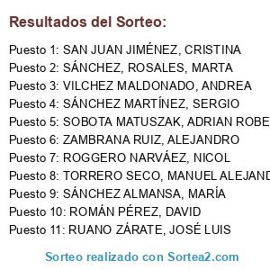 Lista de participantes: ROGGERO NARVÁEZ, NICOL, ROMÁN PÉREZ, DAVID, RUANO ZÁRATE, JOSÉ LUIS, SAN JUAN JIMÉNEZ, CRISTINA, SÁNCHEZ ALMANSA, MARÍA, SÁNCHEZ MARTÍNEZ, SERGIO, SÁNCHEZ, ROSALES, MARTA, SOBOTA MATUSZAK, ADRIAN ROBERT, TORRERO SECO, MANUEL ALEJANDRO, VILCHEZ MALDONADO, ANDREA, ZAMBRANA RUIZ, ALEJANDRO.