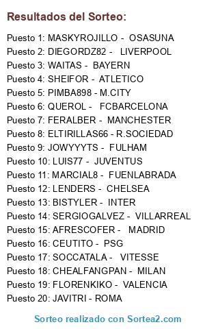 Lista de participantes: AFRESCOFER - MADRID, BISTYLER - INTER, CEUTITO - PSG, DIEGORDZ82 - LIVERPOOL, ELTIRILLAS66 - R.SOCIEDAD, FERALBER - MANCHESTER, FLORENKIKO - VALENCIA, JAVITRI - ROMA, JOWYYYTS - FULHAM, LENDERS - CHELSEA, LUIS77 - JUVENTUS, MASKYROJILLO - OSASUNA, PIMBA898 - M.CITY, QUEROL - FCBARCELONA, SERGIOGALVEZ - VILLARREAL, SHEIFOR - ATLETICO, SOCCATALA - VITESSE, WAITAS - BAYERN, MARCIAL8 - FUENLABRADA, CHEALFANGPAN - MILAN.