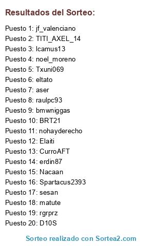 Lista de participantes: TITI_AXEL_14, erdin87, BRT21, jf_valenciano, CurroAFT, sesan, raulpc93, D10S, nohayderecho, matute, noel_moreno, bmwniggas, Nacaan, aser, Spartacus2393, rgrprz, Txuni069, lcamus13, Elaiti, eltato.
