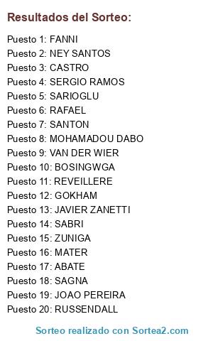 Lista de participantes: SERGIO RAMOS, JAVIER ZANETTI, BOSINGWGA, GOKHAM, ABATE, SABRI, SARIOGLU, FANNI, ZUNIGA, RUSSENDALL, CASTRO, MATER, JOAO PEREIRA, VAN DER WIER, SANTON, MOHAMADOU DABO, REVEILLERE, RAFAEL, SAGNA, NEY SANTOS.