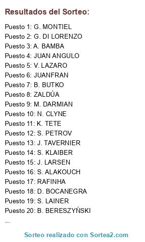 Lista de participantes: JÚNIOR CAIÇARA, D. ZEEFUIK, A. BAMBA, V. LAZARO, N. CLYNE, M. LINNES, B. BUTKO, J. LARSEN, S. KLAIBER, D. BOCANEGRA, B. BERESZYŃSKI, Y. SABALY, A. CONTI, JUAN ANGULO, S. WIDMER, G. DI LORENZO, ZALDÚA, RAFINHA, M. DARMIAN, JUANFRAN, H. TRAORÉ, S. LAINER, RAFAEL, R. KARSDORP, S. PETROV, K. TETE, MIGUELÓN, S. ALAKOUCH, J. TAVERNIER, LÉO MATOS, G. MONTIEL.