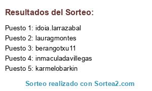 Lista de participantes: a.hernandez.cid, aimibel, Albboxnum1, albert63-pat58, amgm7711, andoniubillos, asisardon, barafl, begonasanz, berangotxu11, blanquita--300, cvicentelizundia66, dcantoyac, esferblue, evamlago, garciagf, gargonto, gentzlalala, hitv, idoia.larrazabal, inmaarceagote, inmaculadavillegas, juanma_lada, karmelobarkin, lagurtza, lauragmontes, lolivelascolopez, lolyg, luz.alma, maajung, machacon, maidertxues, mariadojenaragon, marianmblb, miguel.loza78, monycaza, morozappa, nerea.crespo, perez.jimenez.raul, picanog, projo, rbkg2002, sanchezlucia1983, sissyvegar, sonimarjo, titoboxeo, viota.maria.