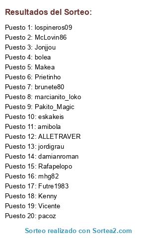 Lista de participantes: jordigrau, bolea, marcianito_loko, Jonjjou, mhg82, Rafapelopo, Pakito_Magic, Prietinho, pacoz, Futre1983, brunete80, lospineros09, Kenny, eskakeis, amibola, McLovin86, ALLETRAVER, Vicente, damianroman, Makea.