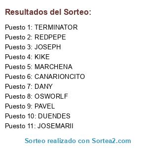 Lista de participantes: JOSEMARII , PAVEL , CANARIONCITO , REDPEPE , DANY , JOSEPH , TERMINATOR , OSWORLF , DUENDES , KIKE , MARCHENA.