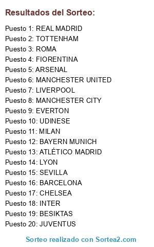 Lista de participantes: MILAN, INTER, REAL MADRID, CHELSEA, MANCHESTER UNITED, LIVERPOOL, JUVENTUS, BARCELONA, ROMA, FIORENTINA, MANCHESTER CITY, ATLÉTICO MADRID, BAYERN MUNICH, ARSENAL, TOTTENHAM, UDINESE, LYON, EVERTON, BESIKTAS, SEVILLA.