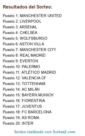 Lista de participantes: AC MILÁN, REAL MADRID, CHELSEA, INTER, FC BARCELONA, AS ROMA, JUVENTUS, MANCHESTER CITY, MANCHESTER UNITED, BAYERN MUNICH, LIVERPOOL, EVERTON, ARSENAL, ATLÉTICO MADRID, TOTTENHAM, VALENCIA CF, FIORENTINA, ASTON VILLA, WOLFSBURGO, PALERMO.
