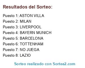 Lista de participantes: MILAN, LIVERPOOL, ASTON VILLA, BARCELONA, TOTTENHAM, BAYERN MUNICH, LAZIO, NO JUEGA.