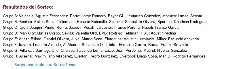 Lista de participantes: Barsa: Franco Servetto, Madrid: Nicolas Gonzalez, Juve: Mateo Sena, bayern: Leandro Almada, PSG: Agustin Molina, Napoli: Franco Garcia, At Madrid: Sebastian Olid, Man U: Rodrigo Fernandez, Chelsea: Facundo Lema, Roma: Joaquin Pesah, Sevilla: Valentin Olid, Tottenham: Horacio Bobadilla, Lyon: Joaquin Prieto, BVB: Rodrigo Feldman, Monaco: Ismael Acosta, Benfica: Felipe Sosa, Inter: Federico Garcia, Arsenal: Maximiliano Vitabarez, Villareal: Santiago Olid, Liverpool: Diego Sosa, Man City: Matias Corbo, Milan: Facundo Acevedo, Sporting: Cristhian Rodriguez, Porto: Jorge Romero, Valencia: Agustin Fernandez, Schalke: Sebastian Olivera, Lazio: Juan Perdomo, Bayer 04 : Leonardo Gonzalez, Fiorentina: Agustin Lachowitz, Atletic Bilbao: Gabriel Olivera, Everton: Pedro Gonzalez, Leicester: Franco Pereira.