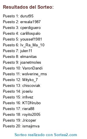 Lista de participantes: wolverine_rms, erreala1987, elmanitas, cperdiguero, durut95, joselu, infivez, chiscoviak, carlillospalo, julen11, youssef1981, riera88, KTDNrubo, ismajimva, joanetmoles, VaronDandi, Mityko_7, Jricoper, royito2005, Iv_Ra_Ma_10.