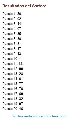 Lista de participantes: 01, 00, 27, 99, 35, 77, 69, 14, 11, 07, 81, 50, 28, 46, 32, 13, 70, 17, 66, 02, 97, 80.
