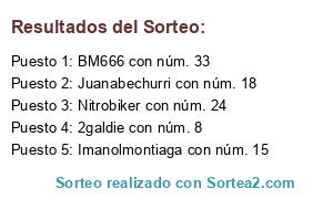 Lista de participantes: 2galdie con núm. 8, Agustin.ferreiroa con núm. 27, Alvaropini91 con núm. 35, Antonioinefto con núm. 11, Antoniojpan con núm. 12, Antoniojpan con núm. 20, BM666 con núm. 33, Cesarlageperez con núm. 26, Enriqueramirez61 con núm. 19, Franpon con núm. 25, Guy.russell con núm. 21, Guy.russell con núm. 22, Igi con núm. 4, Imanolmontiaga con núm. 15, Info con núm. 3, Ja.dominguezcarmona con núm. 32, Jhonnymajoni con núm. 9, JJLAGU con núm. 34, Joejbrown con núm. 13, Jon Ander con núm. 1, Jon Ander con núm. 2, Juanabechurri con núm. 14, Juanabechurri con núm. 18, Juancarlos con núm. 16, Juancarlos con núm. 17, Juancarlos con núm. 23, Juancarlos con núm. 29, Juancarlos con núm. 30, Mercuttio con núm. 5, Moreno.beltran con núm. 6, Nacho.magan con núm. 31, Nitrobiker con núm. 24, Quilezmalo con núm. 7, Raul Núñez con núm. 28, viktoria6870 con núm. 36.