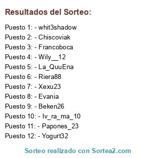 Lista de participantes: - Chiscoviak, - Yogurt32, - Francoboca, - Xexu23, - La_QuuEna, - Wily__12, - Evania, - Papones_23, - Riera88, - Beken26, - Iv_ra_ma_10, - whit3shadow.