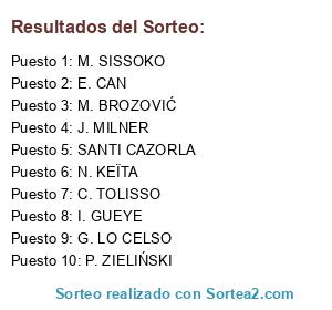 Lista de participantes: E. CAN, M. BROZOVIĆ, G. LO CELSO, N. KEÏTA, I. GUEYE, P. ZIELIŃSKI, SANTI CAZORLA, J. MILNER, M. SISSOKO, C. TOLISSO.
