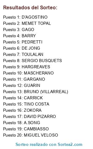 Lista de participantes: CAMBIASSO, DAVID PIZARRO, PEDRETTI, TOULALAN, SERGIO BUSQUETS, MASCHERANO, BARRY, CARRICK, BRUNO (VILLARREAL), GARGANO, TINO COSTA, ZOKORA, MIGUEL VELOSO, GAGO, D'AGOSTINO, HARGREAVES, MEMET TOPAL, GUARIN, DE JONG, A.SONG.