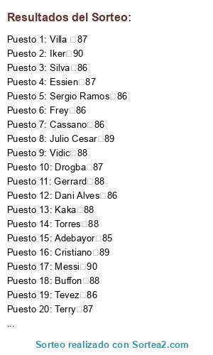 Lista de participantes: Adebayor 85, Diego 87, Tevez 86, Sergio Ramos 86, Eto'o 86, Chiellini 86, Del Piero 86, Totti 86, Cassano 86, Frey 86, Dani Alves 86, Silva 86, Drogba 87, Essien 87, Fabregas 87, Lampard 87, Terry 87, Rooney 87, Xavi 87, Iniesta 87, Villa 87, Arshavin 88, Gerrard 88, Torres 88, Ribery 88, Buffon 88, Puyol 88, Vidic 88, Ibrahimovic 88, Kaka 88, Julio Cesar 89, Cristiano 89, Messi 90, Iker 90.