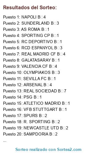 Lista de participantes: R. SPORTING B 2, REAL SOCIEDAD B 7, FC BAYERN B 3, LAZIO B 2, FC BARCELONA B 3, HAMBURGER SV B 3, GALATASARAY B 1, NEWCASTLE UTD B 2, PSG B 1, MANCHESTER CITY B 1, GETAFE CF B 1, NAPOLI B 4, ARSENAL B 4, REAL MADRID CF B 4, SPURS B 2, FIORENTINA B 3, AJAX B 2, RC DEPORTIVO B 1, SAMPDORIA B 2, AS ROMA B 1, UD LAS PALMAS B 1, FC PORTO B 3, BOCA JUNIORS B 2, OLYMPIAKOS B 3, VFB STUTTGART B 1, RCD ESPANYOL B 3, LIVERPOOL B 3, VALENCIA CF B 4, SUNDERLAND B 3, SEVILLA FC B 1, VFL WOLFSBURG B 2, ATLETICO MADRID B 1, SPORTING CP B 1, PSV B 1.