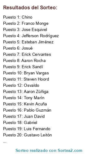 Lista de participantes: Julio, Osvaldo, Chino Diego, Alonso, Orbita, Gerson Araya, Aaron Zúñiga, Aaron Rocha, Esteban Jiménez, Franco Monge, Frede Vargas, Gabriel, Gustavo, Gustavo Leitón, Jefferson, Jefferson Rodríguez, Jonathan Veláquez, Jordan Mora, Jose Esquivel, Josué, Juan David, Kenneth Monge, Kevin Jiménez, Kevin Acuña, Adrián Villa, Alex Cortés, Andrés Chaves, Andrés Calderón, Andy Bolaños, Bogantes, Bryan Vargas, Carlos Bustamante, Kevin Fernández, Luis Fernando, Luis Arley, Maikel, Manfred, Marcelo Campos, Miguel, Minor, Carlos Beita, Chino, Christian García, Cristal Ureña, Diego Alonso, Eddy Corrales, Erick Cervantes, Erick Sandí, Pigui, Randall Arrieta, Steven Hoord, Tony Marín, Lucho, Pablo Guzmán.