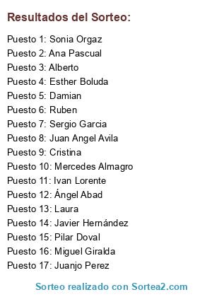 Lista de participantes: Ángel Abad, Santiago Muñoz, Javier Hernández, Jose Serrano, Juan Angel Avila, Pilar Doval, Ana Pascual, Mercedes Almagro, Sergio Garcia, Ruben, Damian, Ivan Lorente, Ivan Rubio, Sonia Orgaz, Manuel Jarillo, Juanjo Perez, Miguel Giralda, Paula Sanchez, Cristina, Esther Boluda, Laura, Javier Rivas, Alberto.