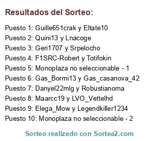 Lista de participantes: Guille651crak y Eltate10, Quini13 y Lnacoge, Elega_Mow y Legendkiller1234, Maarcc19 y LVO_Vettelhd, Danyel22mlg y Robustianoma, F1SRC-Robert y Totifokin, Gas_Bormi13 y Gas_casanova_42, Geri1707 y Srpelocho, Monoplaza no seleccionable - 1, Monoplaza no seleccionable - 2.