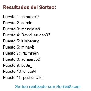 Lista de participantes: minavit, PiEminen, oliva94, mendiata9, bo3n_, David_arucas97, luishenrry, admin, Inmune77, pedroncillo, adriian352.