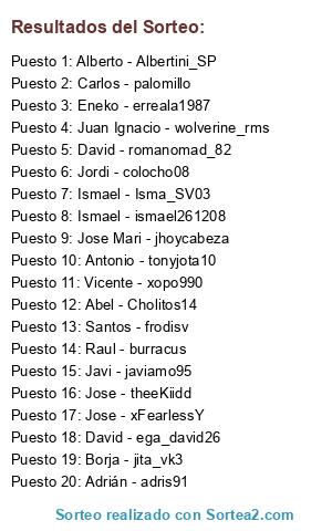 Lista de participantes: Jose - theeKiidd, Alberto - Albertini_SP, Jordi - colocho08, Antonio - tonyjota10, Borja - jita_vk3, Juan Ignacio - wolverine_rms, Ismael - Isma_SV03, Jose Mari - jhoycabeza, Ismael - ismael261208, David - romanomad_82, David - ega_david26, Jose - xFearlessY, Eneko - erreala1987, Abel - Cholitos14, Raul - burracus, Javi - javiamo95, Adrián - adris91, Vicente - xopo990, Carlos - palomillo, Santos - frodisv.