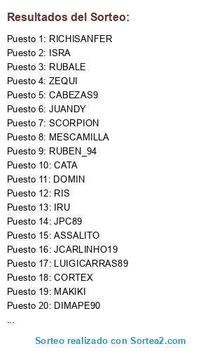 Lista de participantes: MESCAMILLA, RUBEN_94, SEFIROTTT, FLAKOJMAYS, AYTOR96, LUIGICARRAS89, CIPOTTI, RICHISANFER, JPC89, MAKIKI, IRU, JUANDY, ZEQUI, DOMIN, CABEZAS9, RUBALE, POLETINHO10, CORTEX, ROQUELUIS, PEDRITO HOSPI, CATA, ISRA, SCORPION, DEIVIZ81, ASSALITO, MISTIAN11, RIVALTALES, HYBRID, XEXU23, JCARLINHO19, DIMAPE90, RIS.