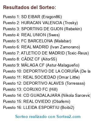 Lista de participantes: REAL SOCIEDAD (Omar Little), DEPORTIVO ALAVES (Torressss), FC BARCELONA (Malabar), CORUXO FC (Hill), HURACAN VALENCIA (Trosky), DEPORTIVO DE LA CORUÑA (De la Penya), CD GUADALAJARA (Nikola Sarcevic), SD EIBAR (Eragon86), ATLETICO DE MADRID (Toxic-Reus), REAL UNION (Swes), SPORTING DE GIJON (Rebekin), REAL MADRID (Ivan Zamorano), LLEIDA ESPORTIU (Boibi2), REAL OVIEDO (Obafemi), MÁLAGA CF (Astur-Malagueño), CÁDIZ CF (Aitor55).