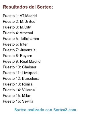 Lista de participantes: M.United, AT.Madrid, Real Madrid, Barcelona, Villareal, Inter, Juventus, Tottehamm, M.City, Sevilla, Arsenal, Liverpool, Chelsea, Bayern, Roma, Milan.