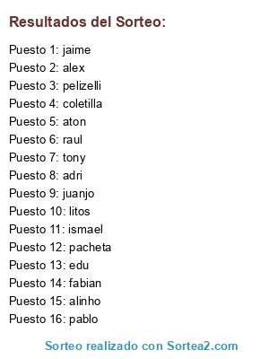 Lista de participantes: pablo, tony, juanjo, raul, jaime, alex, aton, coletilla, ismael, pelizelli, edu, adri, pacheta, alinho, litos, fabian.