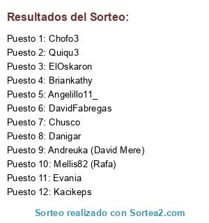 Lista de participantes: DavidFabregas, Danigar, ElOskaron, Evania, Angelillo11_, Kacikeps, Quiqu3, Chusco, Chofo3, Briankathy, Andreuka (David Mere), Mellis82 (Rafa).
