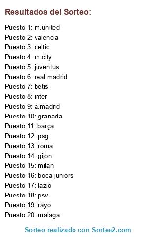 Lista de participantes: real madrid, m.united, valencia, psv, lazio, betis, milan, inter, juventus, barça, psg, m.city, roma, celtic, boca juniors, a.madrid, malaga, rayo, gijon, granada.